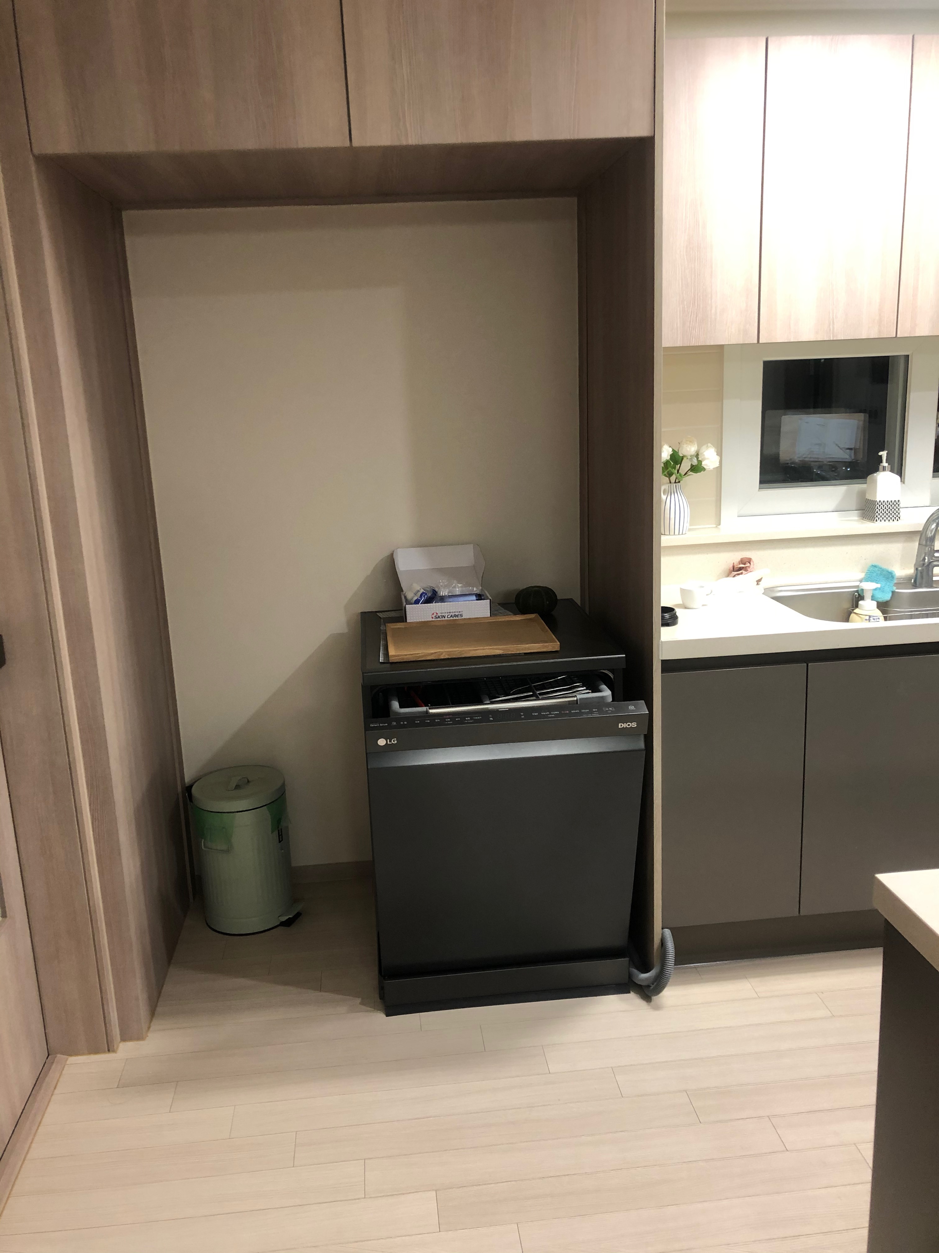 사진에서 보면 신축 단지들은 보통 냉장고장이 2군대 있어서 비어있는 곳에 식기세척기 설치가 가능하고, 이전에 구축 살때는 세탁실가는 문옆에다가 설치하기도 했습니다.